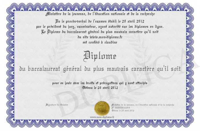 Envoyez par email votre Diplôme du baccalaureat général du plus mauvais caractère qu'il soit personalisé