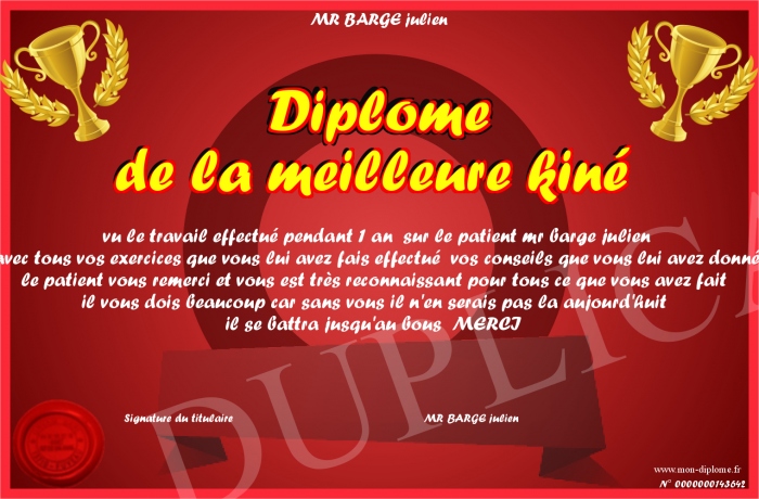 Envoyez par email votre Diplôme de la meilleure kiné personalisé