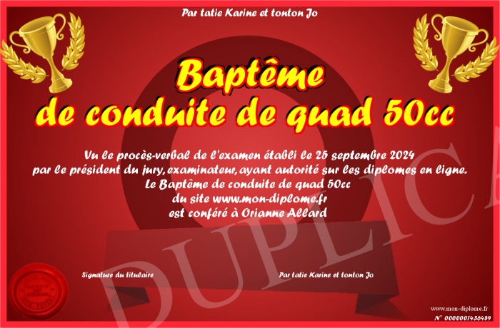 Envoyez par email votre Baptême de conduite de quad 50cc personalisé