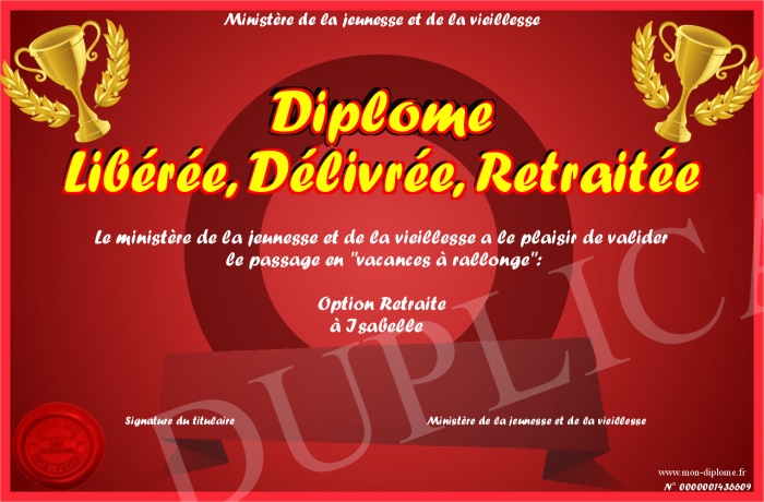 Envoyez par email votre Diplôme Libérée, Délivrée, Retraitée personalisé