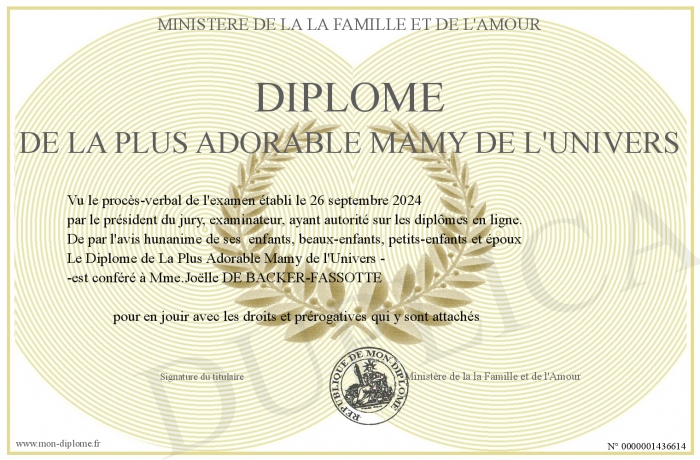Envoyez par email votre Diplôme de La Plus Adorable Mamy de l'Univers personalisé