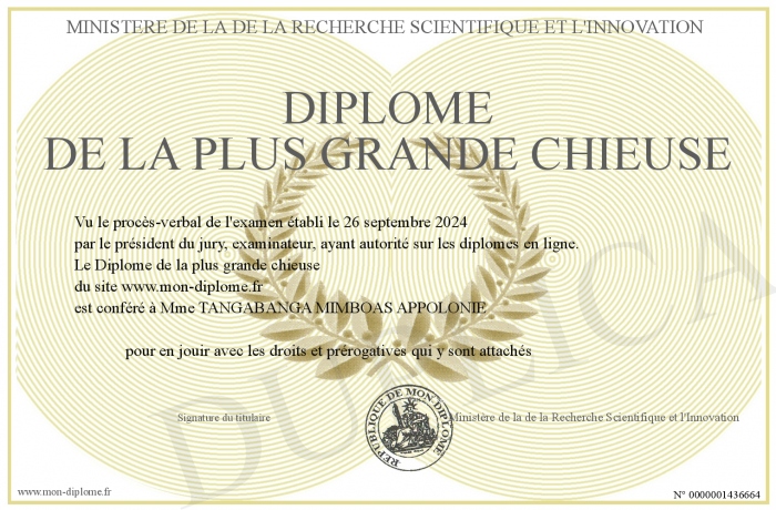 Envoyez par email votre Diplôme de la plus grande chieuse personalisé