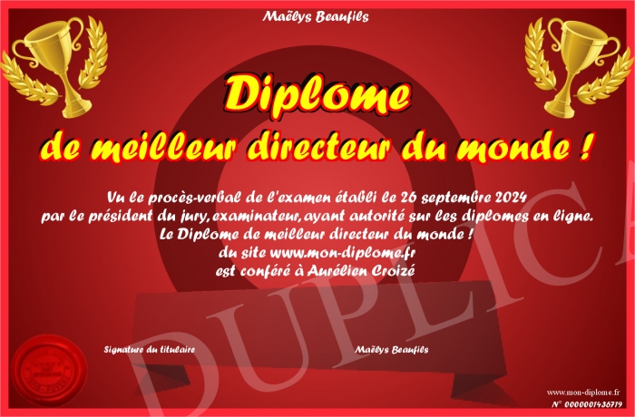 Envoyez par email votre Diplôme de meilleur directeur du monde ! personalisé