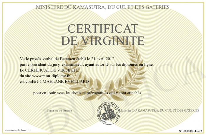 Envoyez par email votre CERTIFICAT DE VIRGINITE personalisé