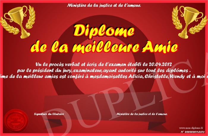 Envoyez par email votre Diplome de la meilleure Amie personalisé