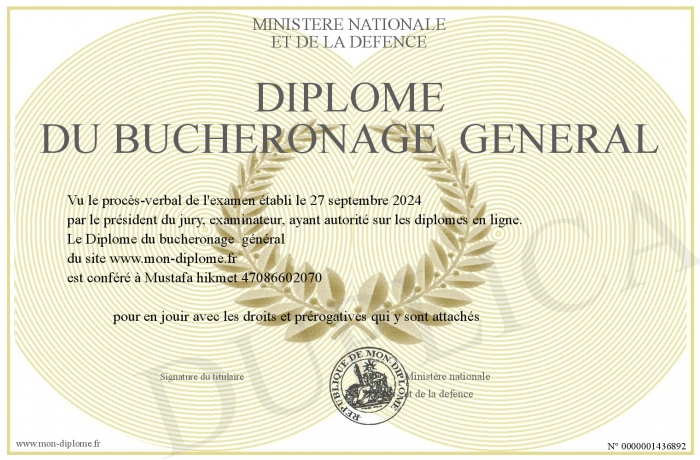 Envoyez par email votre Diplôme du bucheronage général personalisé