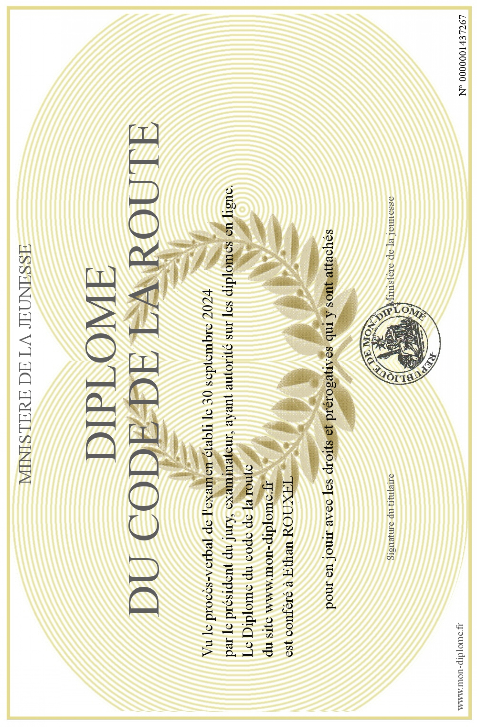 Envoyez par email votre Diplôme du code de la route personalisé