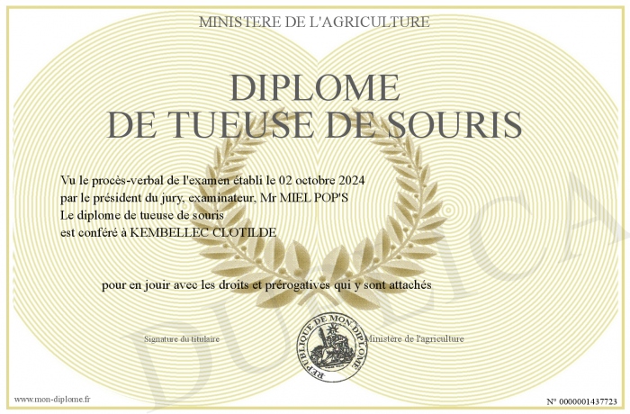 Envoyez par email votre Diplôme de tueuse de souris personalisé