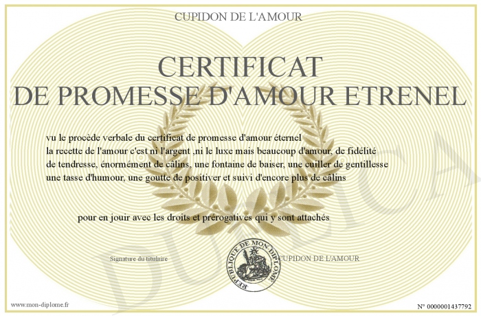 Envoyez par email votre CERTIFICAT DE PROMESSE D'AMOUR ETRENEL personalisé