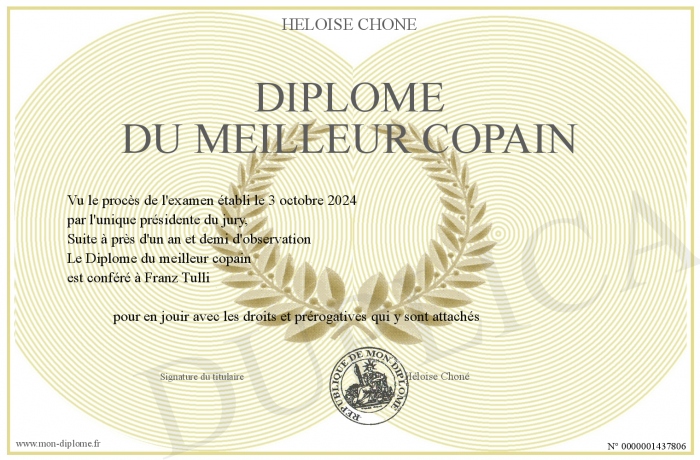 Envoyez par email votre Diplôme du meilleur copain personalisé