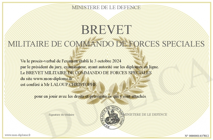 Envoyez par email votre BREVET MILITAIRE DE COMMANDO DE FORCES SPECIALES personalisé
