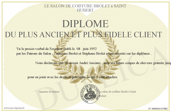 Envoyez par email votre Diplôme du plus ancien et plus fidèle client personalisé