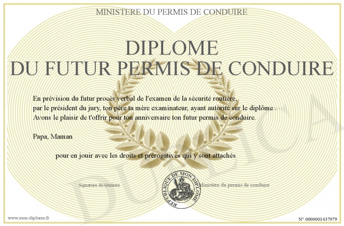 Envoyez par email votre Diplôme du futur permis de conduire personalisé