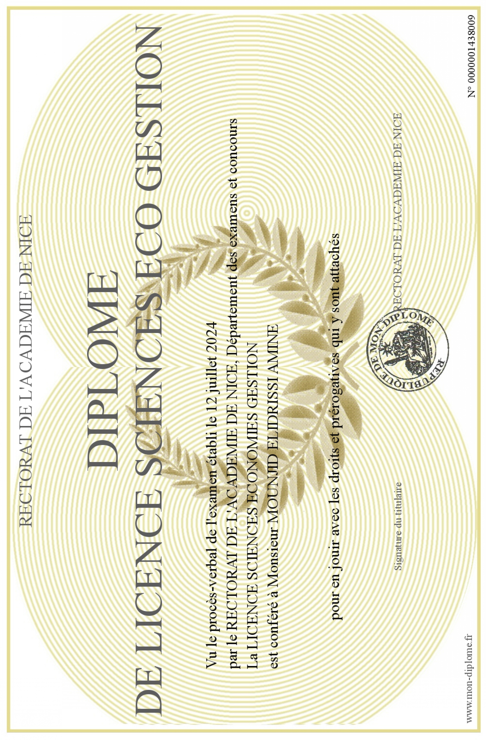 Envoyez par email votre DIPLOME DE LICENCE SCIENCES ECO GESTION personalisé