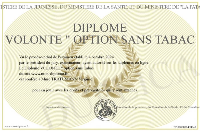 Envoyez par email votre Diplôme VOLONTE - option sans Tabac personalisé