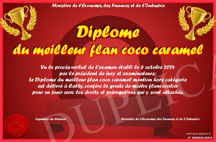 Envoyez par email votre Diplôme du meilleur flan coco caramel personalisé