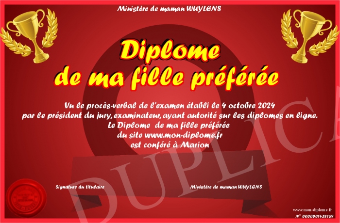 Envoyez par email votre Diplôme de ma fille préférée personalisé