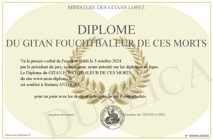 Envoyez par email votre Diplôme du GITAN FOUCHTBALEUR DE CES MORTS personalisé
