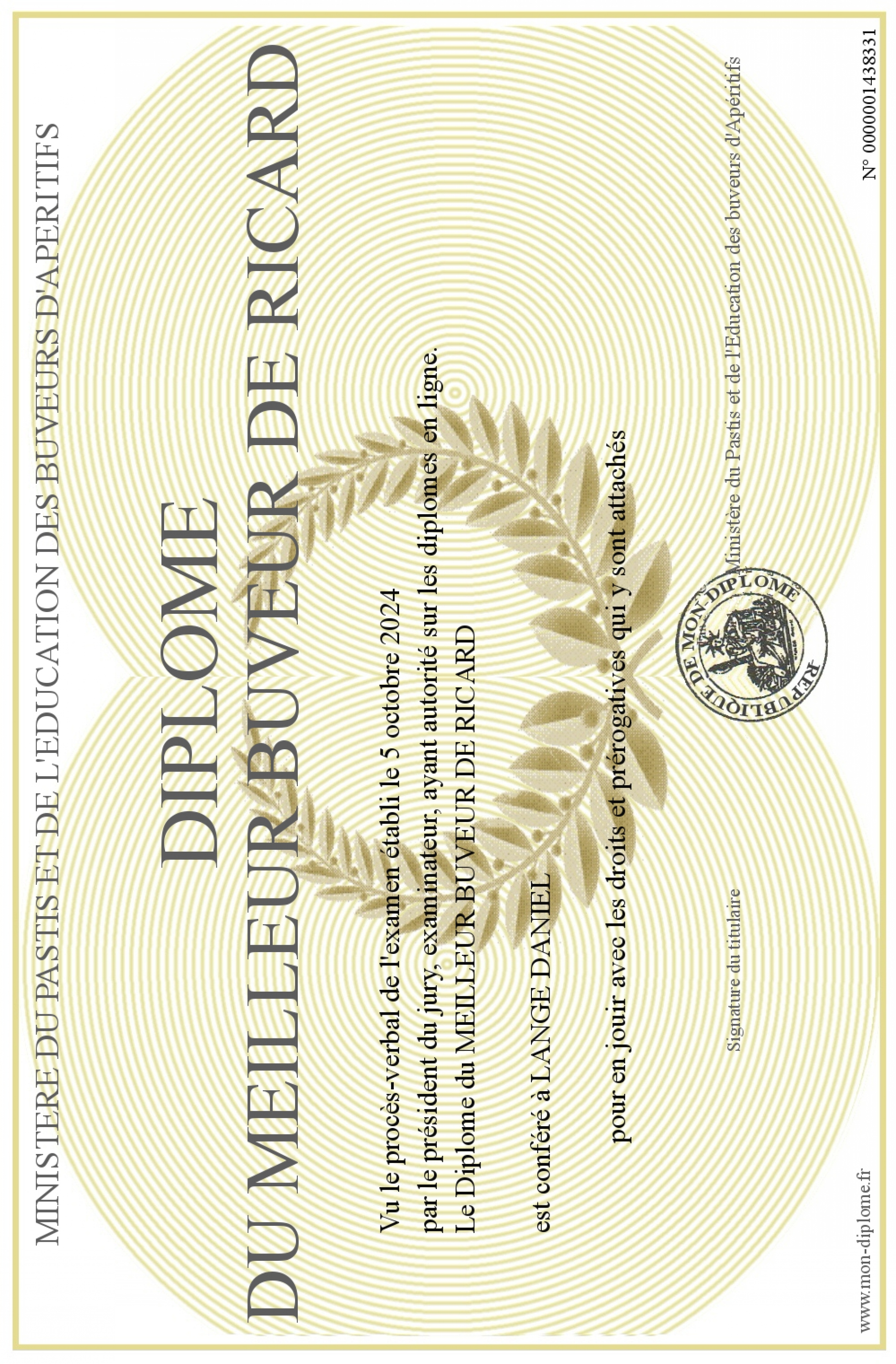 Envoyez par email votre Diplôme du MEILLEUR BUVEUR DE RICARD personalisé