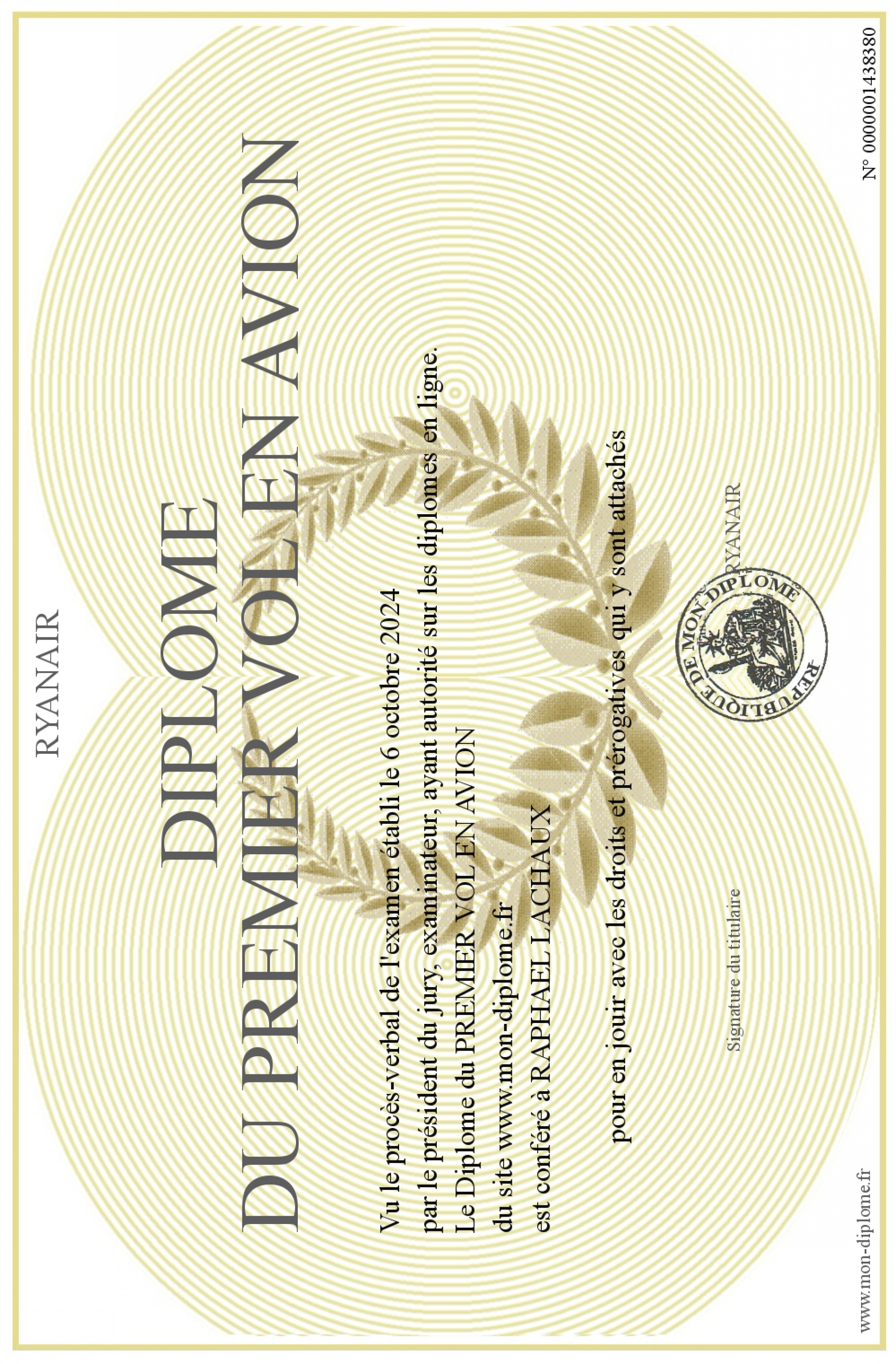 Envoyez par email votre Diplôme du PREMIER VOL EN AVION personalisé