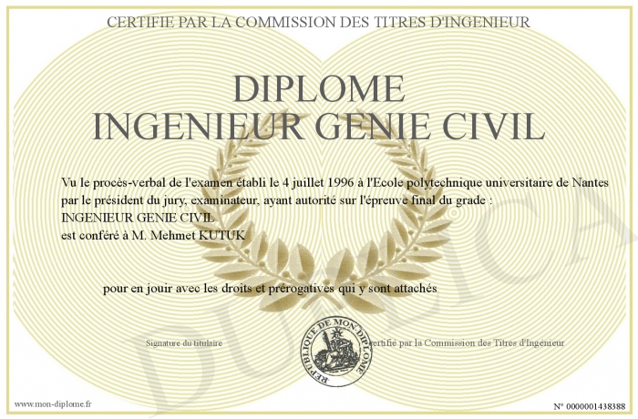 Envoyez par email votre Diplôme ingénieur génie civil personalisé