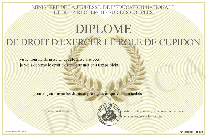Envoyez par email votre Diplôme de droit d'exercer le role de cupidon personalisé