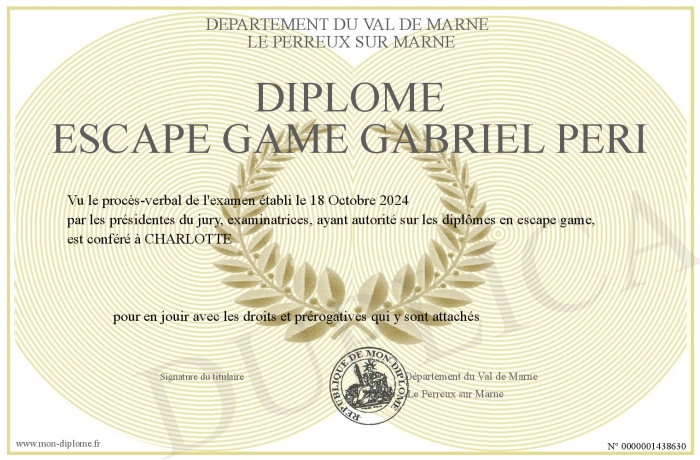 Envoyez par email votre Diplôme Escape game Gabriel Péri personalisé