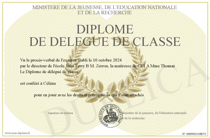 Envoyez par email votre Diplôme de délégué de classe personalisé