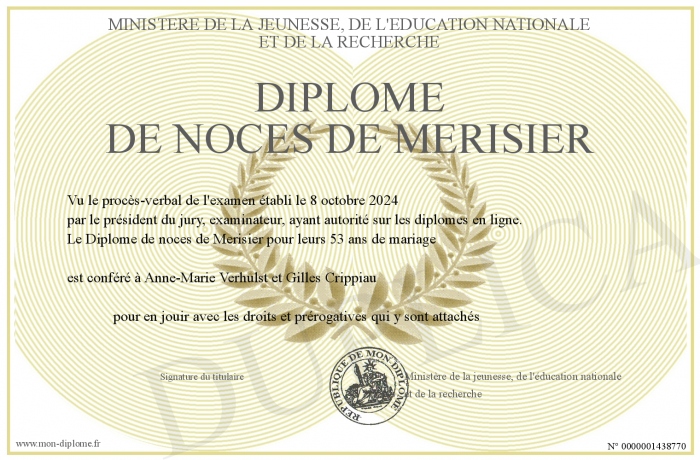 Envoyez par email votre Diplôme de noces de Merisier personalisé