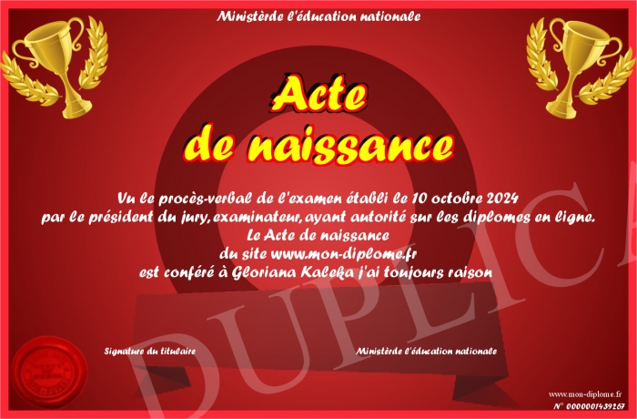 Envoyez par email votre Acte de naissance personalisé