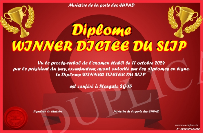 Envoyez par email votre Diplôme WINNER DICTEE DU SLIP personalisé