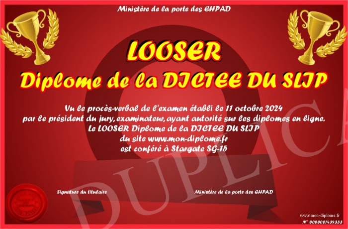 Envoyez par email votre LOOSER Diplôme de la DICTEE DU SLIP personalisé