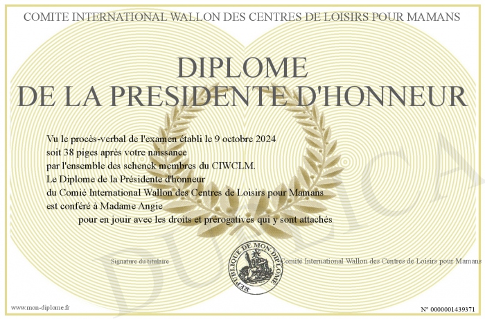 Envoyez par email votre Diplôme de la Présidente d'honneur personalisé