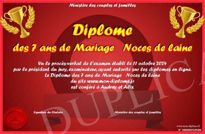 Envoyez par email votre Diplôme des 7 ans de Mariage Noces de laine personalisé