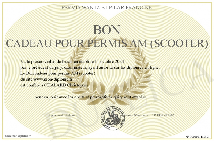 Envoyez par email votre Bon cadeau pour permis AM (scooter) personalisé