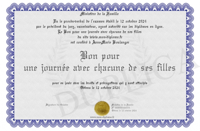 Envoyez par email votre Bon pour une journée avec chacune de ses filles personalisé