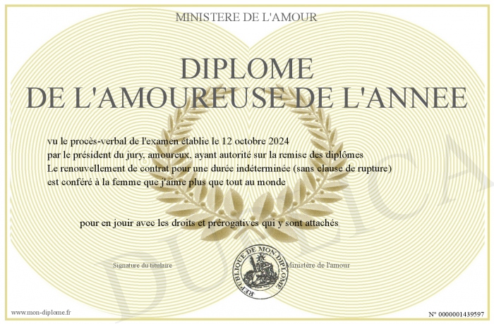 Envoyez par email votre Diplôme de l'amoureuse de l'année personalisé