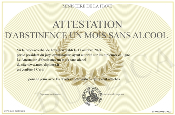 Envoyez par email votre Attestation d'abstinence un mois sans alcool personalisé