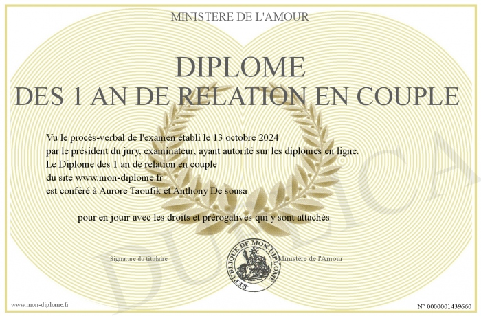 Envoyez par email votre Diplôme des 1 an de relation en couple personalisé