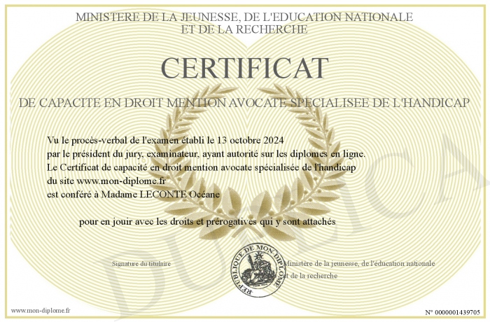 Envoyez par email votre Certificat de capacité en droit mention avocate spécialisée de l'handicap personalisé