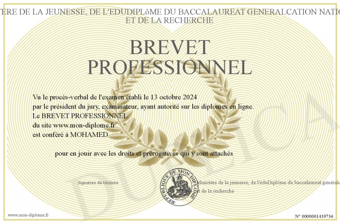 Envoyez par email votre BREVET PROFESSIONNEL personalisé