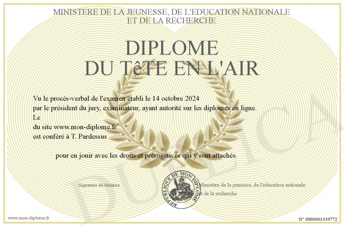 Envoyez par email votre Diplôme du Tête en l'air personalisé