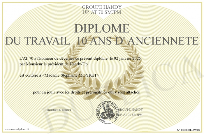 Envoyez par email votre Diplôme du travail 10 ans D' ancienneté personalisé