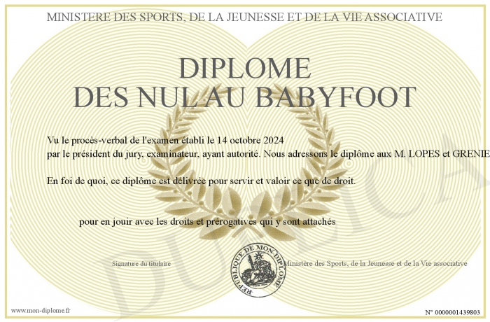 Envoyez par email votre Diplôme des NUL AU BABYFOOT personalisé