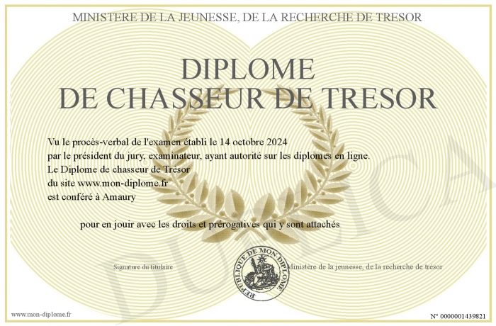 Envoyez par email votre Diplôme de chasseur de Trésor personalisé