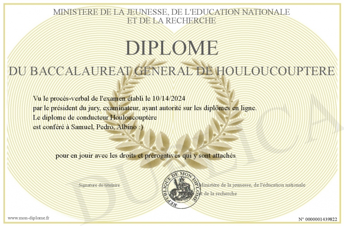 Envoyez par email votre Diplôme du baccalaureat général de Houloucouptère personalisé