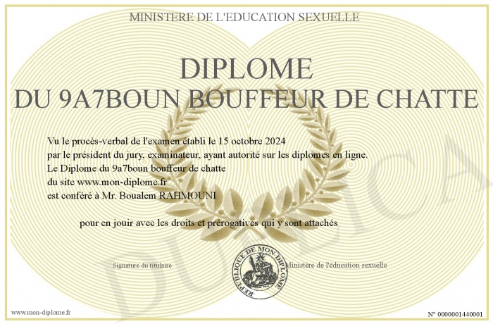 Envoyez par email votre Diplôme du 9a7boun bouffeur de chatte personalisé