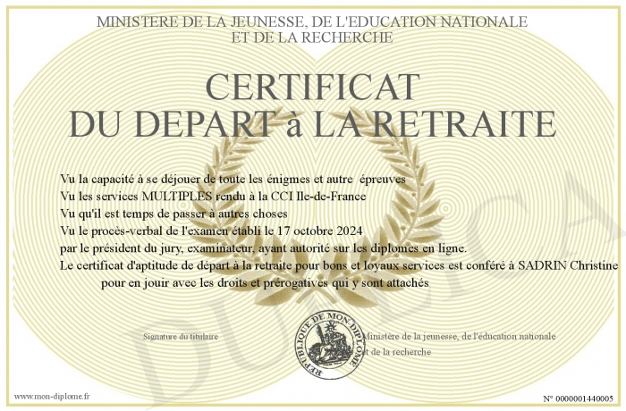 Envoyez par email votre CERTIFICAT du départ à la retraite personalisé