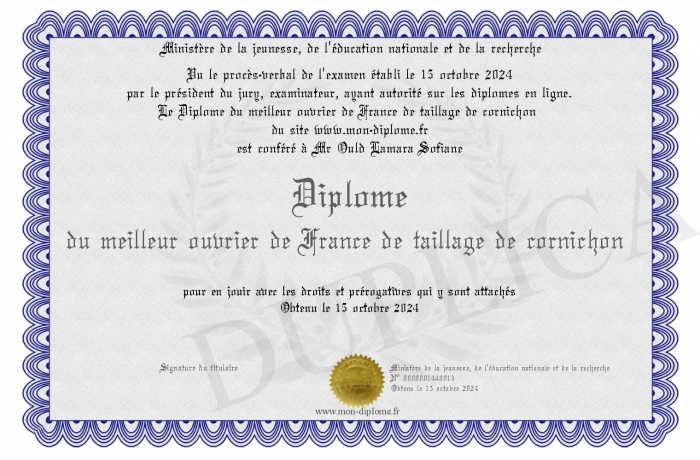 Envoyez par email votre Diplôme du meilleur ouvrier de France de taillage de cornichon personalisé
