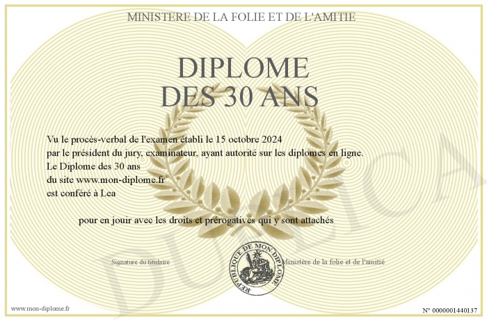 Envoyez par email votre Diplôme des 30 ans personalisé